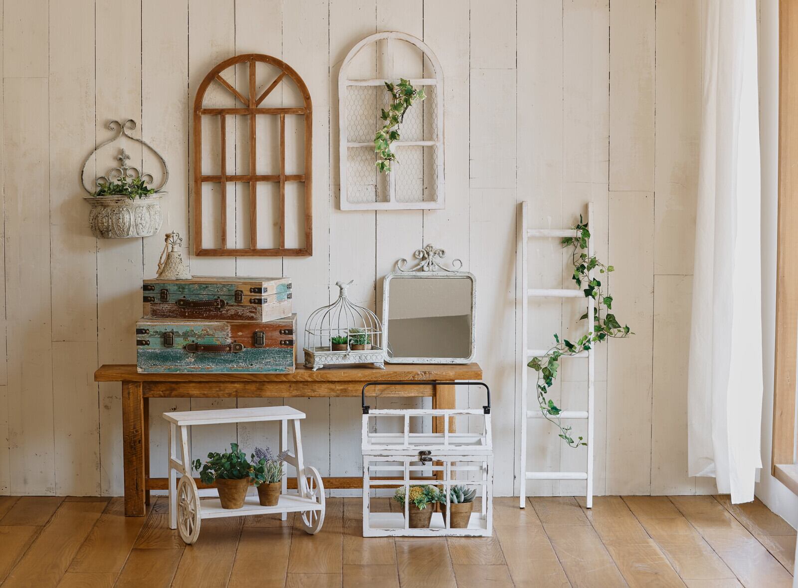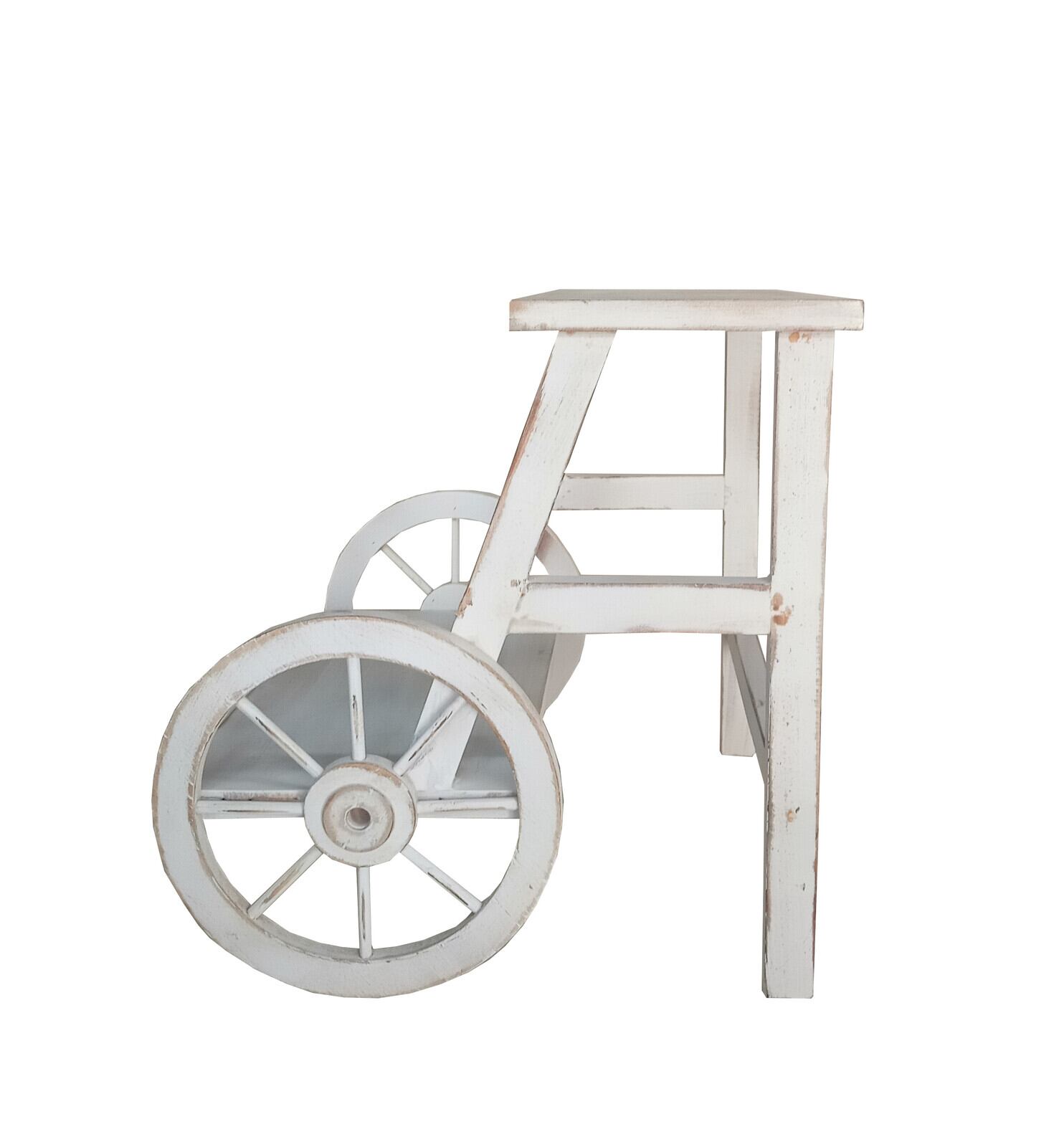 ●車輪のレトロな形状と、天然木材の風合いが、お庭や玄関先に温かみのあるカントリーテイストを演出します。古びた風合いの木材や、レトロな車輪は、植物の緑や花の鮮やかな色彩を際立たせる背景となります。シンプルな鉢を乗せても、まるで片田舎の風景を切り取ったかのような、絵になるシーンを演出します。