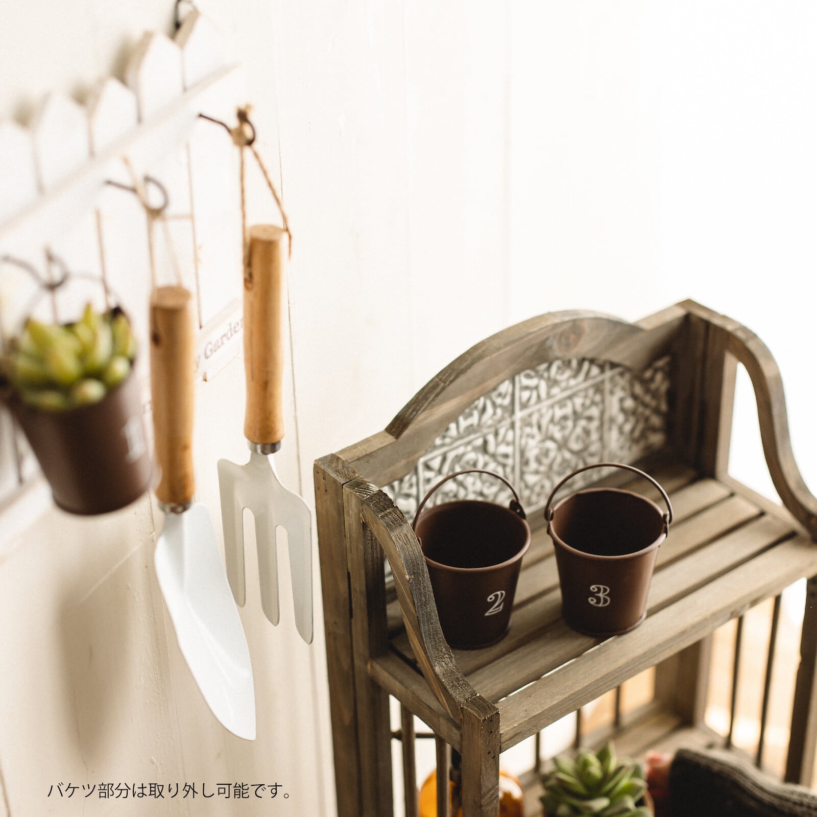 水を入れてのご使用は不可ですが多肉植物やサボテンなど水のあまりいらない植物を植えるのGOODですね。(その際はバケツを外して水漏れ注意して霧吹きであげてください。)
