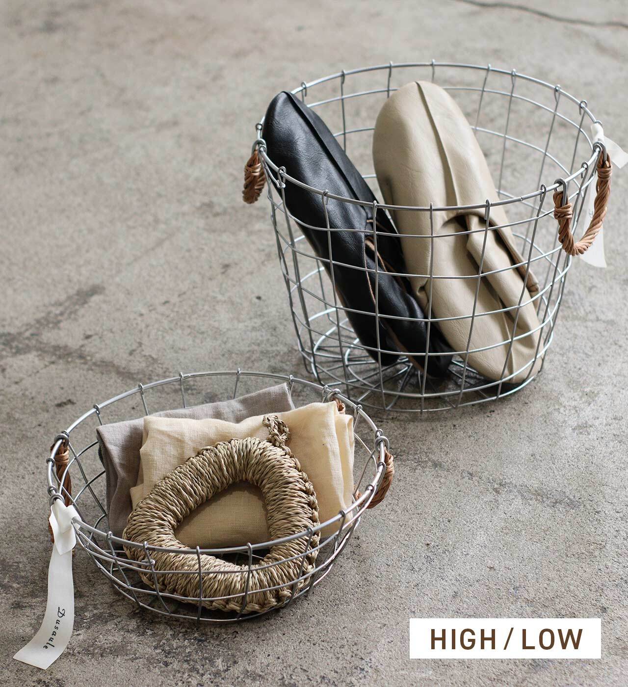 Dusaule(デュソール)シリーズは落ち着いたシルバー塗装で仕上げ、アクセントに柳を使ったワイヤーバスケットです。ロータイプはコンパクトであまり底が深くない分、必要なものをサッと取り出しやすいのでりんごやオレンジなどのミカンを入れたり、毎朝使う化粧品やハンドクリームなどケア用品の収納にもおすすめのサイズ感です。ハイタイプは軽量で持ち運びやすく、ブランケットや雑誌を入れるリビング収納やランドリーバスケットとしても活躍してくれます。手作りのため、まっすぐでないところも無骨な雰囲気を盛り上げてくれる味わいに。バスケットの左右にハンドルが付いているので持ちやすく、お部屋間の移動もラクラク。その他のDusaule(デュソール)シリーズで収納を揃えても統一感が出ます。